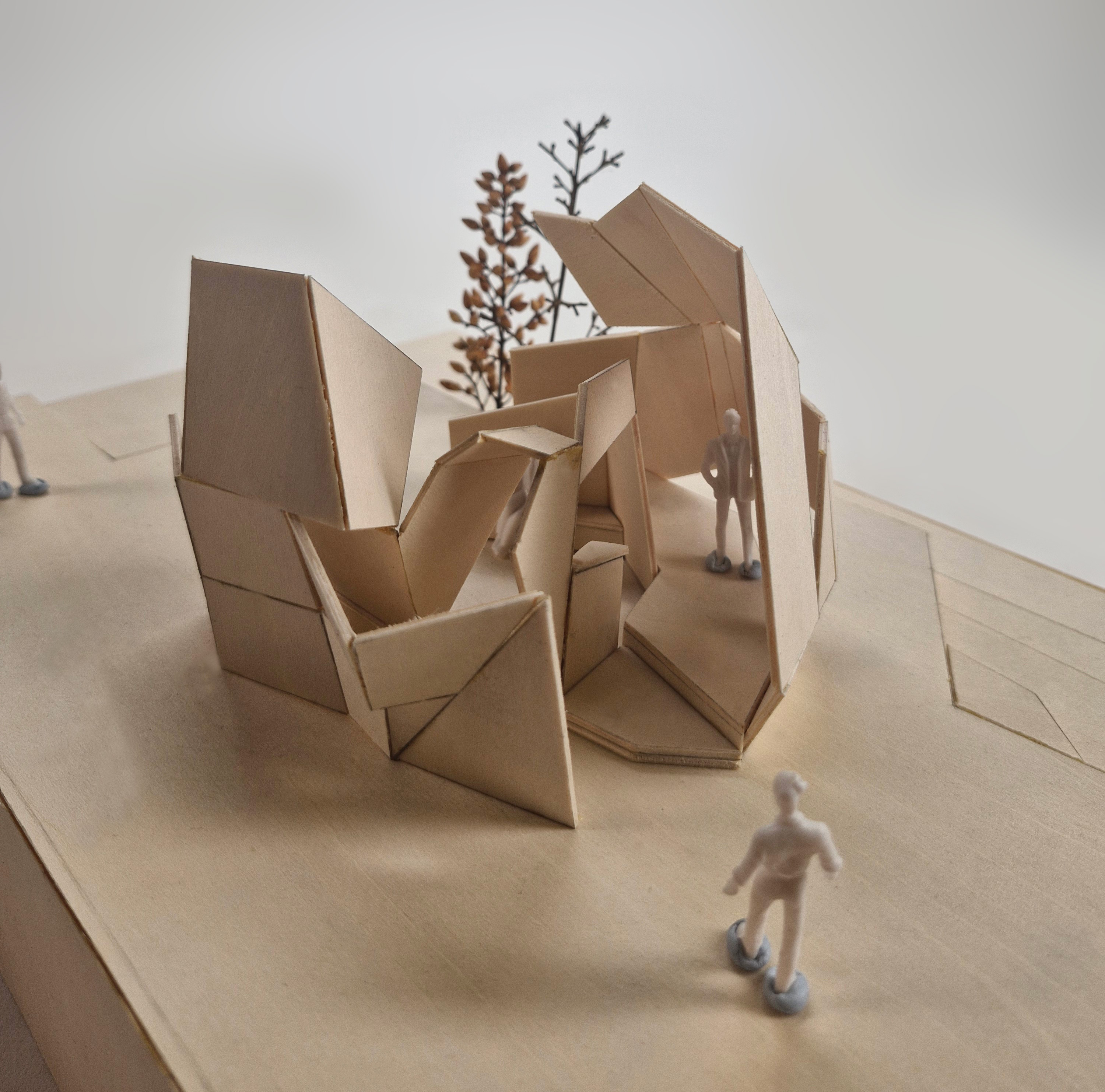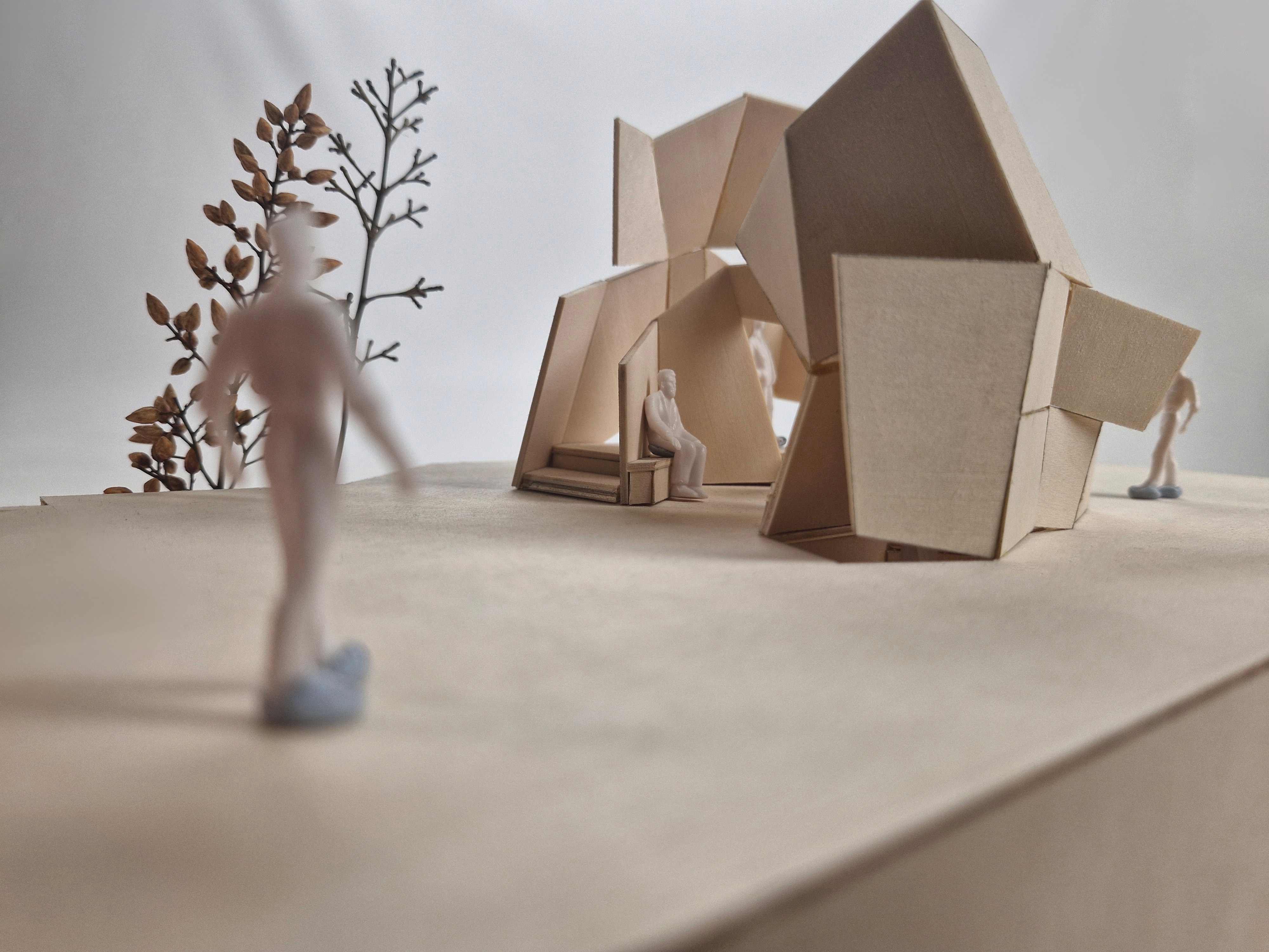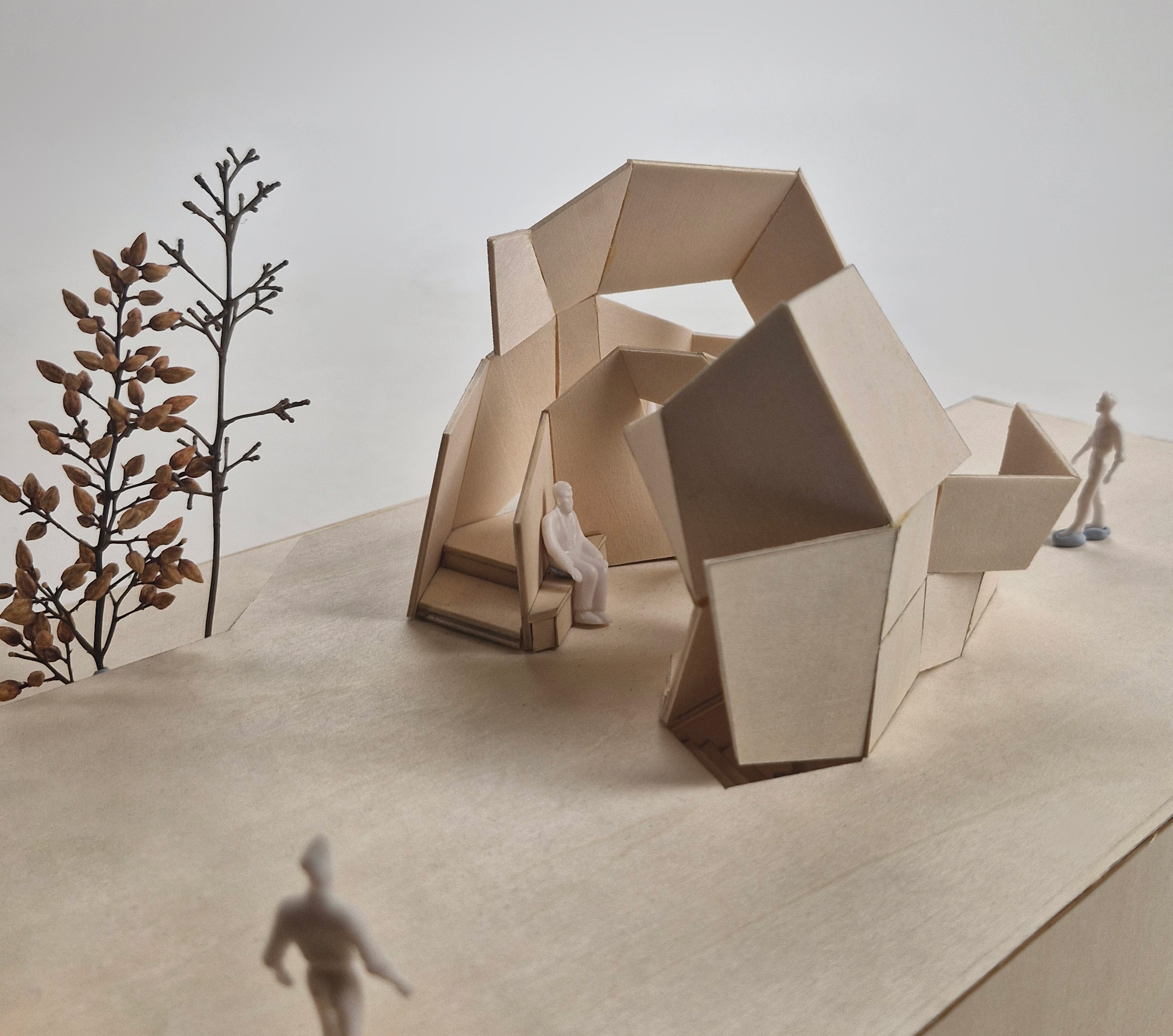 This model is my midterm assignment, themed around "park installations." In addition to focusing on the aesthetic appeal of installation art, I aimed to incorporate practical functionality into the project. As a result, I designed a pavilion as the central concept and included artistic elements to enhance its beauty. For this project, I was inspired by the world-known architect, Zaha Hadid's design concepts of dramatic light, space utilization, fluidity, dynamic spaces, and layering. This concept model features two spatial zones and a single circulation route. As a conceptual design, it is not tailored to any specific user group or intended function. Drawing inspiration from sunlight for this threshold study, I used a flashlight to simulate natural lighting effects on my model. The outcome revealed a fascinating interplay of light and shadow across the form. For this circulation precedent, I explored the idea of fluidity in my design, creating a dynamic connection between the two spaces. This approach draws inspiration from the folding and creasing circulation concept I developed in my previous model. In this threshold study, I began by experimenting with the concept of layering. The model’s walls reflect this idea through a visibly stratified structure. This process illustrates how I developed my design iteratively from the physical model in Assessment 2 to the final iteration. For example, the top view shows how the original two spaces were transformed into three, with additional circulation paths introduced. Furthermore, to make the design resemble a real pavilion, I explored how to add structural thickness to the model. This marks the final stage of my iterative design process. I intentionally set a design deadline to bring the process to a close, which helped me avoid overworking the concept. Stopping at this point also ensured I had sufficient time for fabrication and model-making.