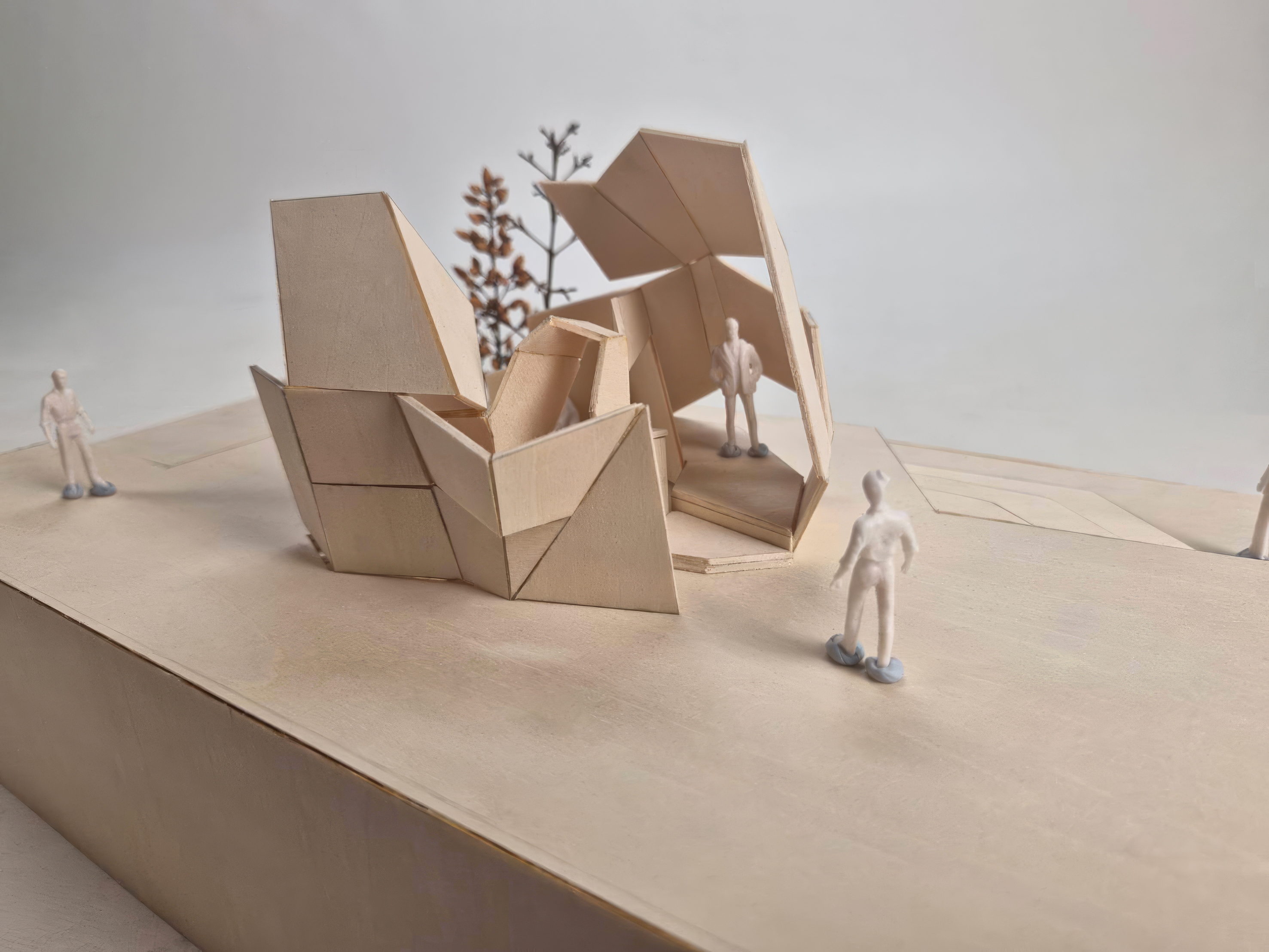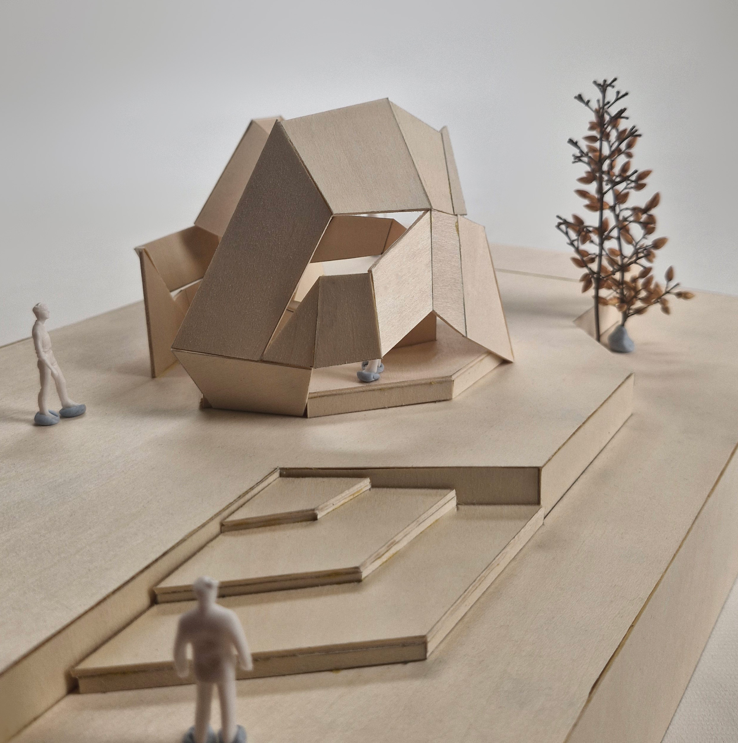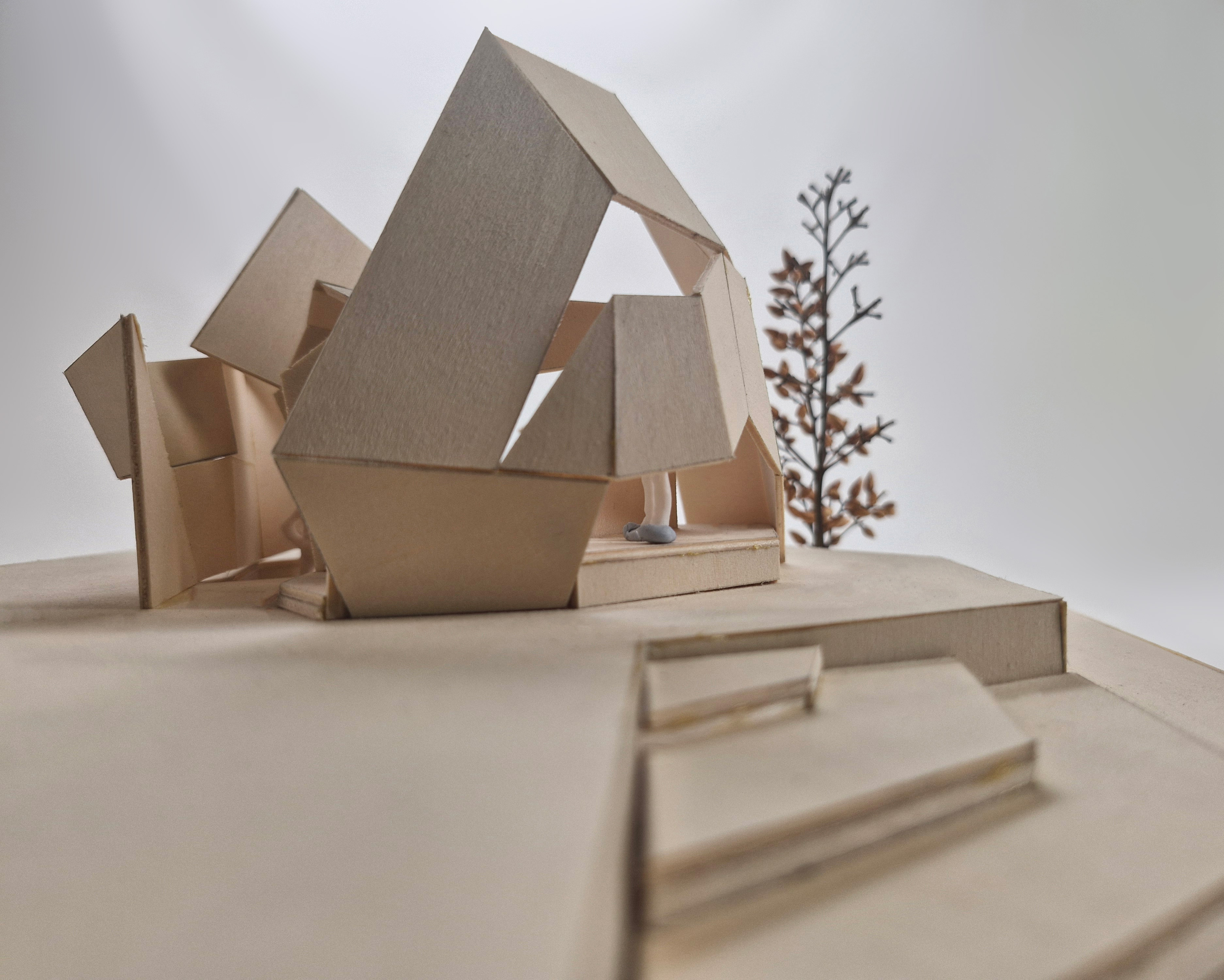 This model is my midterm assignment, themed around "park installations." In addition to focusing on the aesthetic appeal of installation art, I aimed to incorporate practical functionality into the project. As a result, I designed a pavilion as the central concept and included artistic elements to enhance its beauty. For this project, I was inspired by the world-known architect, Zaha Hadid's design concepts of dramatic light, space utilization, fluidity, dynamic spaces, and layering. This concept model features two spatial zones and a single circulation route. As a conceptual design, it is not tailored to any specific user group or intended function. Drawing inspiration from sunlight for this threshold study, I used a flashlight to simulate natural lighting effects on my model. The outcome revealed a fascinating interplay of light and shadow across the form. For this circulation precedent, I explored the idea of fluidity in my design, creating a dynamic connection between the two spaces. This approach draws inspiration from the folding and creasing circulation concept I developed in my previous model. In this threshold study, I began by experimenting with the concept of layering. The model’s walls reflect this idea through a visibly stratified structure. This process illustrates how I developed my design iteratively from the physical model in Assessment 2 to the final iteration. For example, the top view shows how the original two spaces were transformed into three, with additional circulation paths introduced. Furthermore, to make the design resemble a real pavilion, I explored how to add structural thickness to the model. This marks the final stage of my iterative design process. I intentionally set a design deadline to bring the process to a close, which helped me avoid overworking the concept. Stopping at this point also ensured I had sufficient time for fabrication and model-making.