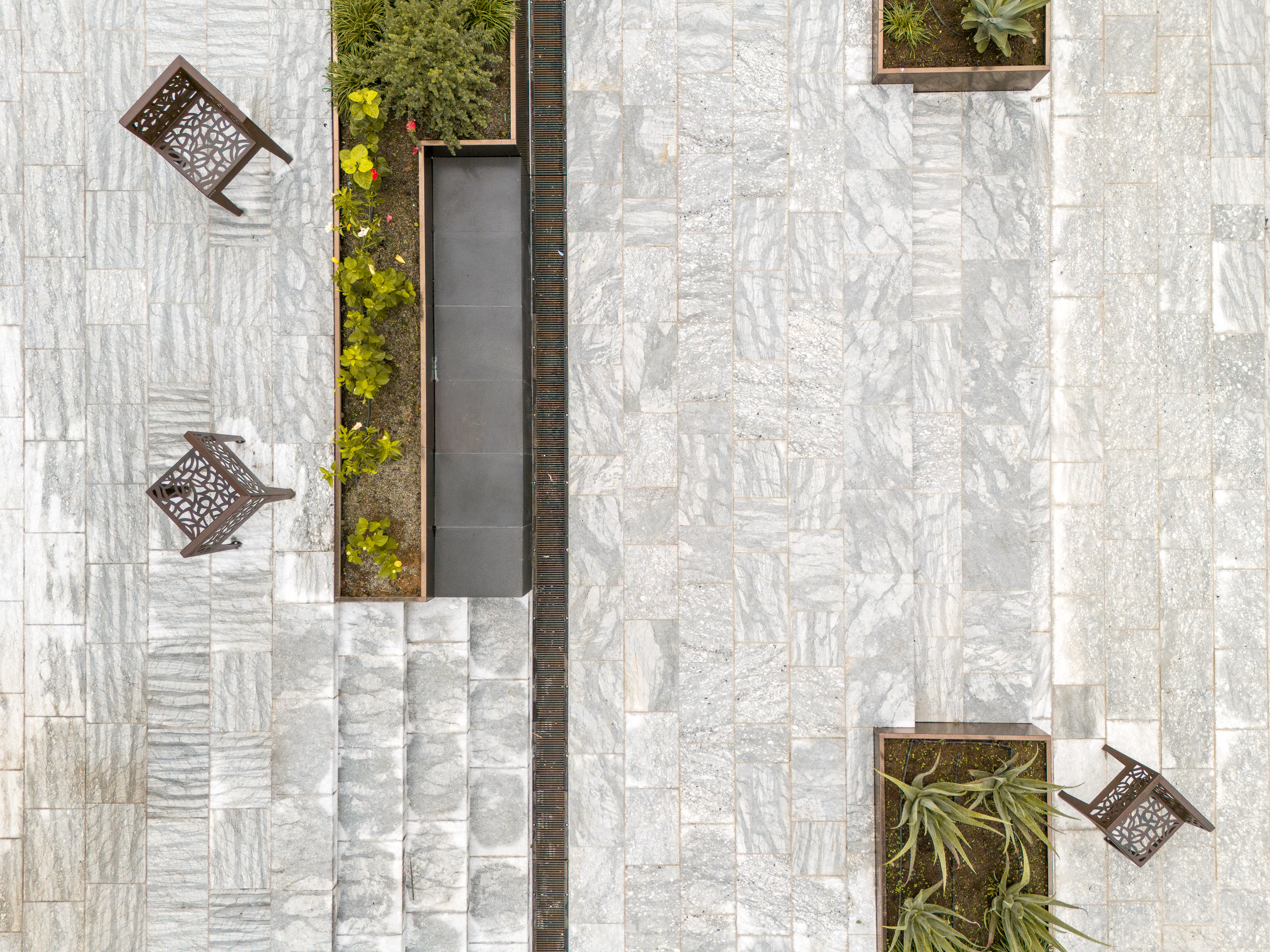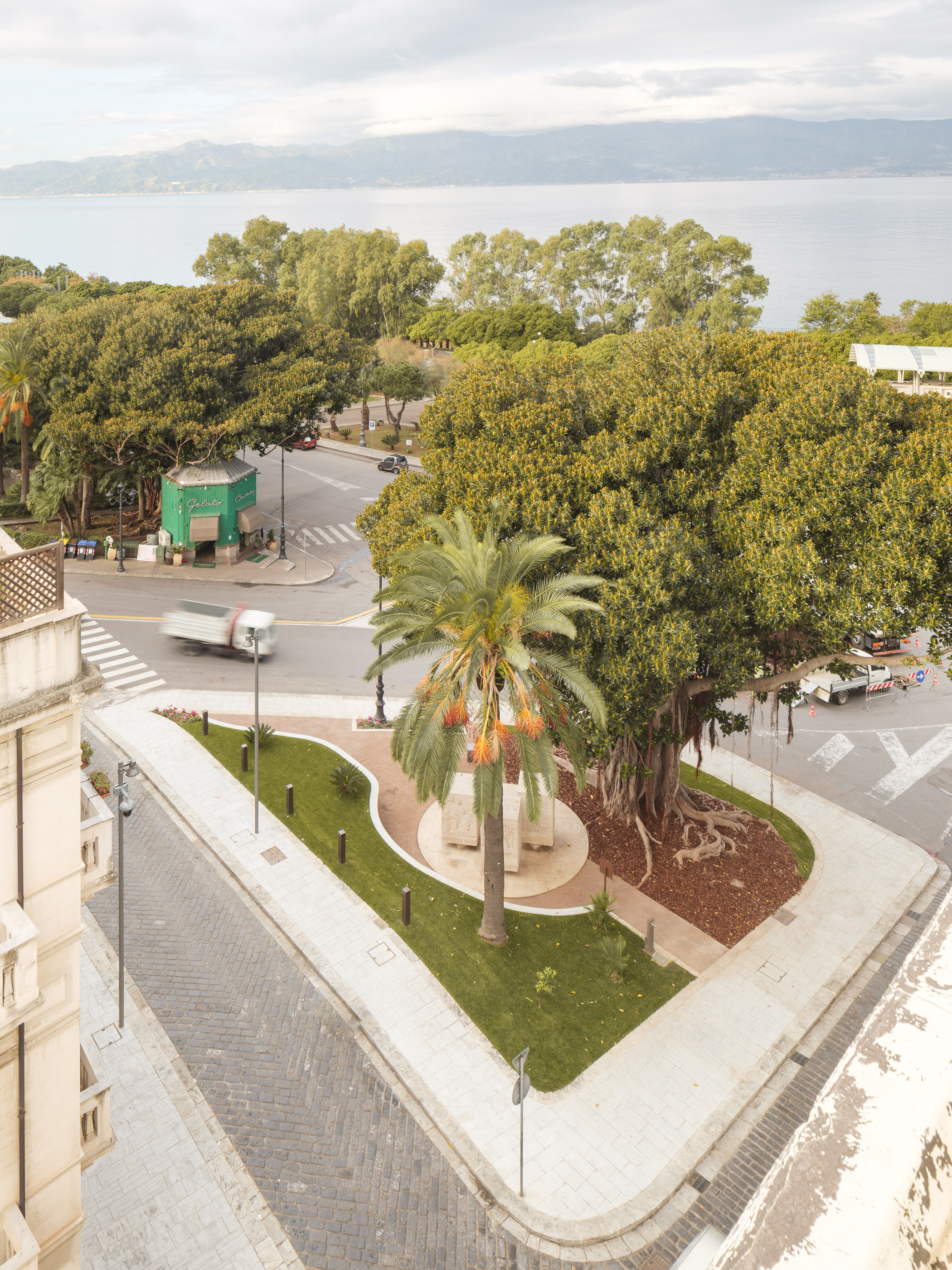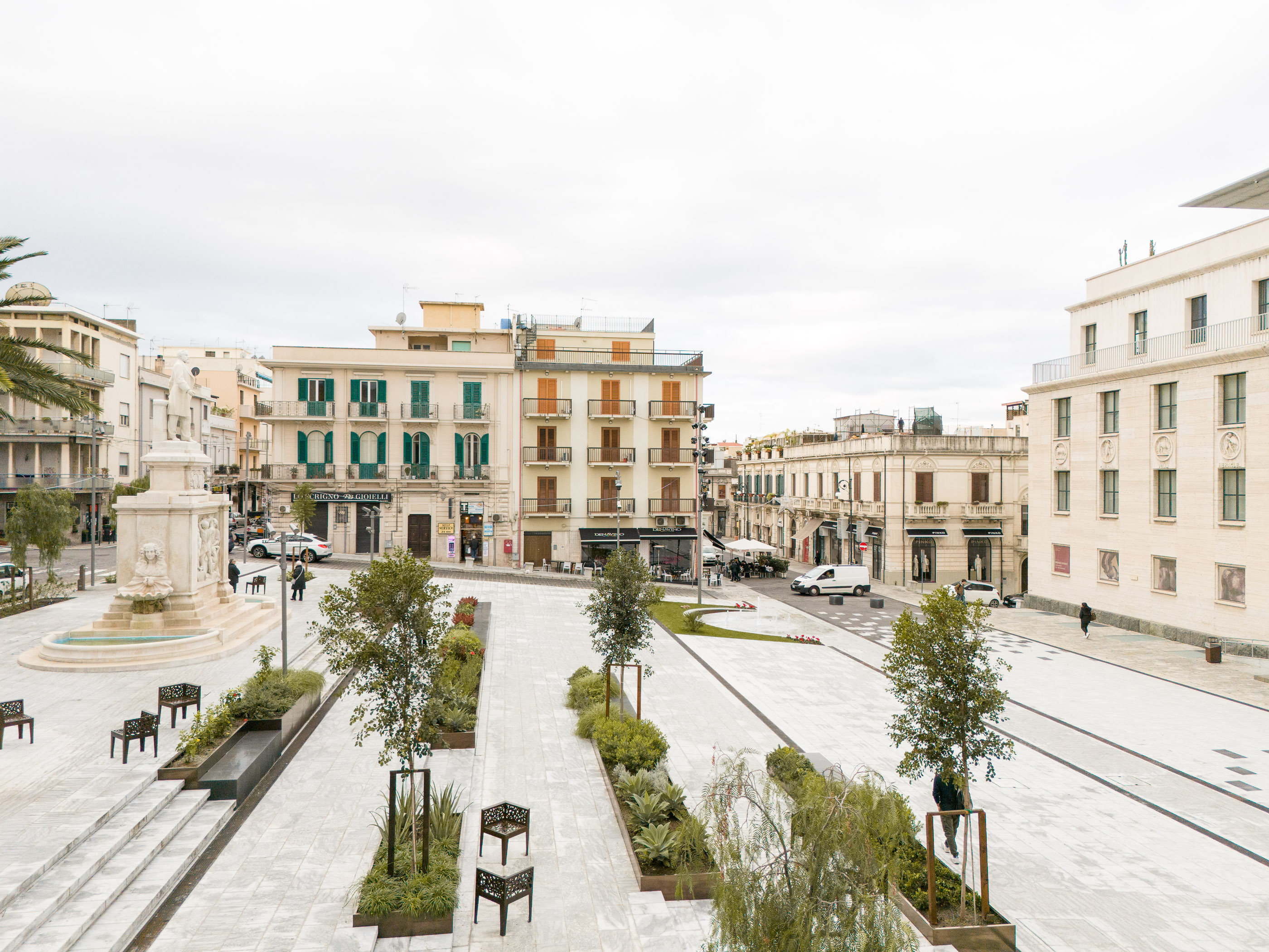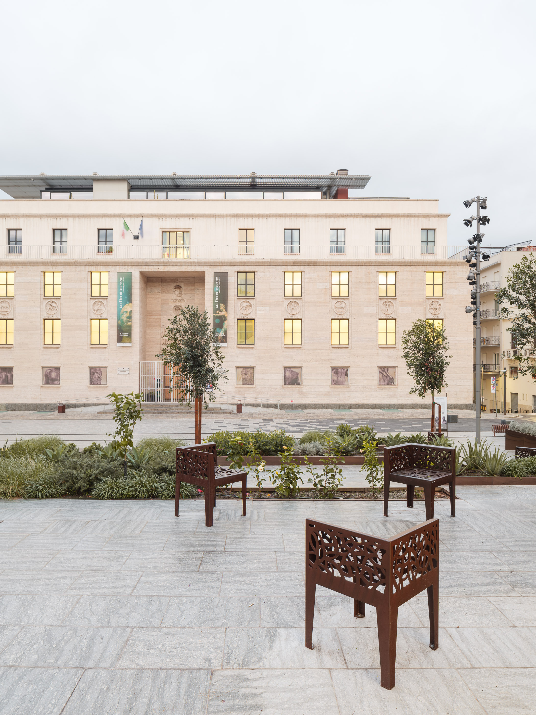The client's objective was to carry out the redevelopment and restoration of the square in order to integrate the National Archaeological Museum (where the Riace Bronzes are exhibited) and the urban context. The project is very simple, low-impact and ecologically compatible, thanks to the recycling of rainwater, the new RGB+W lighting system entirely based on LED sources, and the planting of new trees and numerous shrubs from the Mediterranean maquis. We’ve combined innovation and tradition: we used stainless steel sheets coated with an innovative PVD system to create solid, iridescent surfaces for the construction of the planters; we repurposed the existing paving stones from beneath the asphalt of the surrounding streets; and we reused the curbstones and stones from the historic staircase. The square is entirely pedestrianised and accessible to all types of users.The new square creates a large urban canvas where recreational and leisure activities can take place both day and night. We’ve introduced two new tall lighting poles, on which groups of projectors capable of illuminating both the Piacentini façade of the Museum and the entire square. The dynamic colour-changing LED strip system, placed in the groove of the new steps, shapes the emotional lighting of the urban square. At night, the new space is a metaphor for the territory: with the blue light, the sea waves breaking on the shore; with the green light, a mountainous slope from the nearby Aspromonte is descending onto the square. The green area has a high biomass that ensures adequate absorption of pollutant emissions into the atmosphere and favours sufficient evapotranspiration to ensure an adequate microclimate. The project envisaged an automatic drip-wing irrigation system for the irrigation of the public green spaces, with water coming from the rainwater collection tanks and recycling tanks for the fountain water.