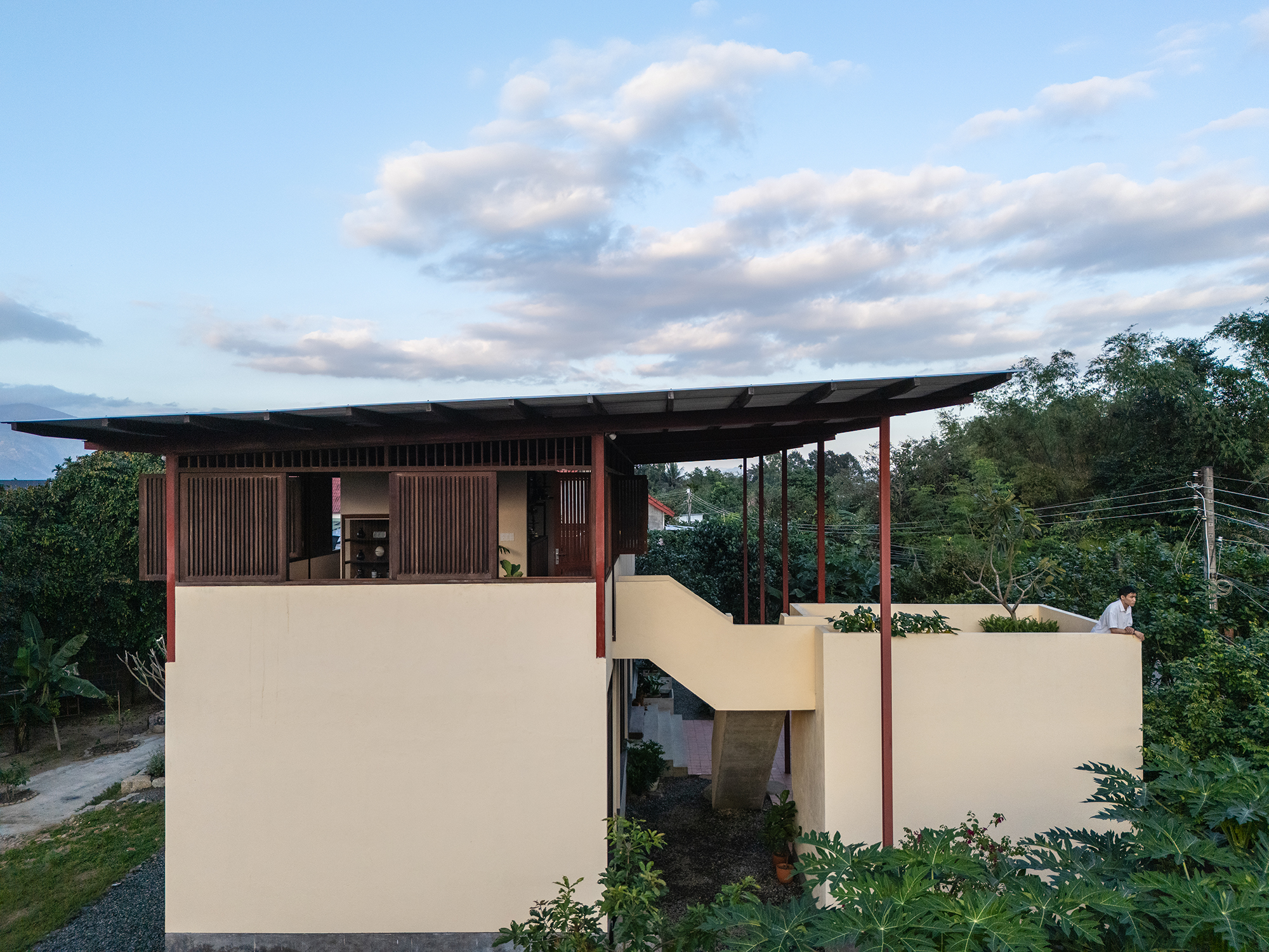 Located in Dien Khanh district, just 10 kilometers west of Nha Trang city, DB Horizon is designed to replace an old ancestral house, associated with many beautiful memories. The house is a seamless blend of contemporary living with vernacular design principles, prioritizing natural ventilation, passive cooling and harmonious connection with the surrounding natural environment. The main goal of the project is to create a multi-generational home that balances privacy and social interaction. The house is hierarchical and divided into distinct zones while maintaining a smooth transition between indoor and outdoor areas: The common spaces are brought to the first floor, while the private bedrooms are located on the ground floor. Visitors do not enter the house directly, but instead ascend an external staircase that leads to the living room and an outdoor terrace on the first floor. Stepping inside, a cluster of functional spaces (worship area, kitchen and storage) creates a subtle boundary between the guest area and the private area of the family. The first floor serves as the living center with a living room, kitchen, dining area, worship space, common living space and terrace. All are thoughtfully arranged to promote family gatherings and maintain cultural traditions. An internal staircase serves as a private connection between the bedrooms on the ground floor and the open living area above. In addition, an outside garage to minimize noise and dust from vehicles. The 360-degree windows on the first floor enhance the connection with nature, providing abundant daylight while maximizing cross-ventilation. A thick metal roof with a moderate slope extends outward, providing shade, rain protection, and a transitional space between levels. The wooden door system with openings above ensures a continuous airflow, contributing to the sustainable and energy-efficient design of the house.