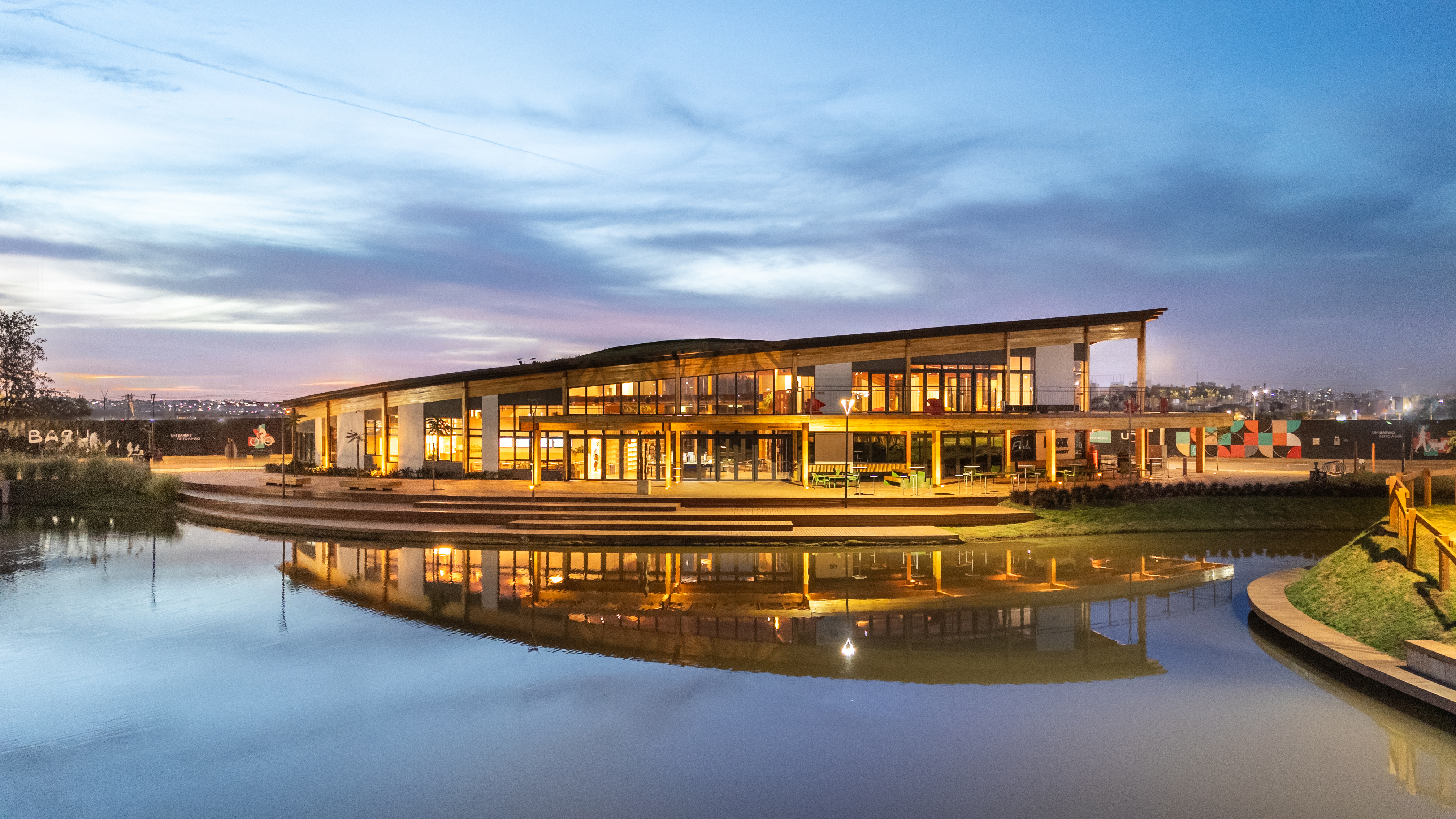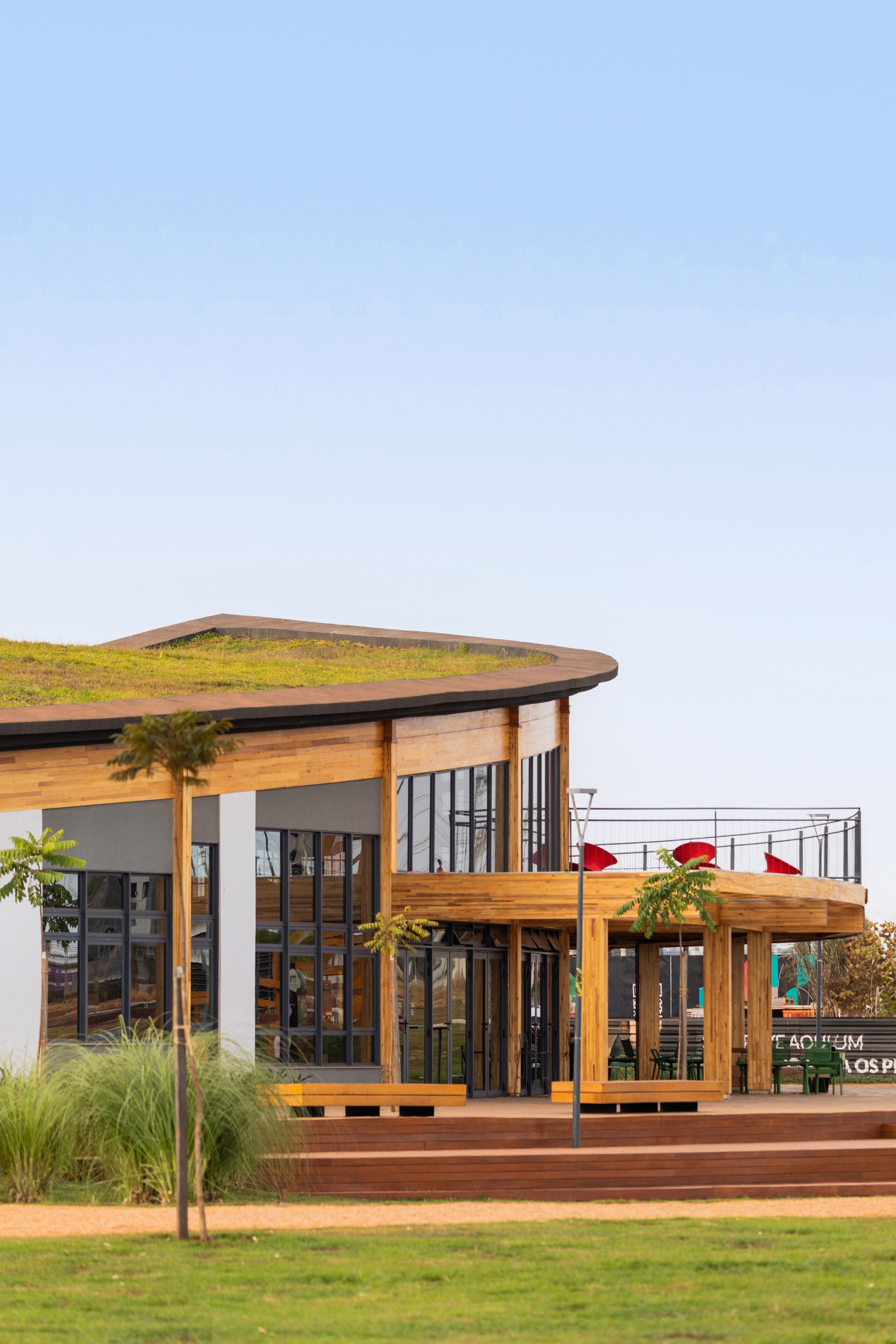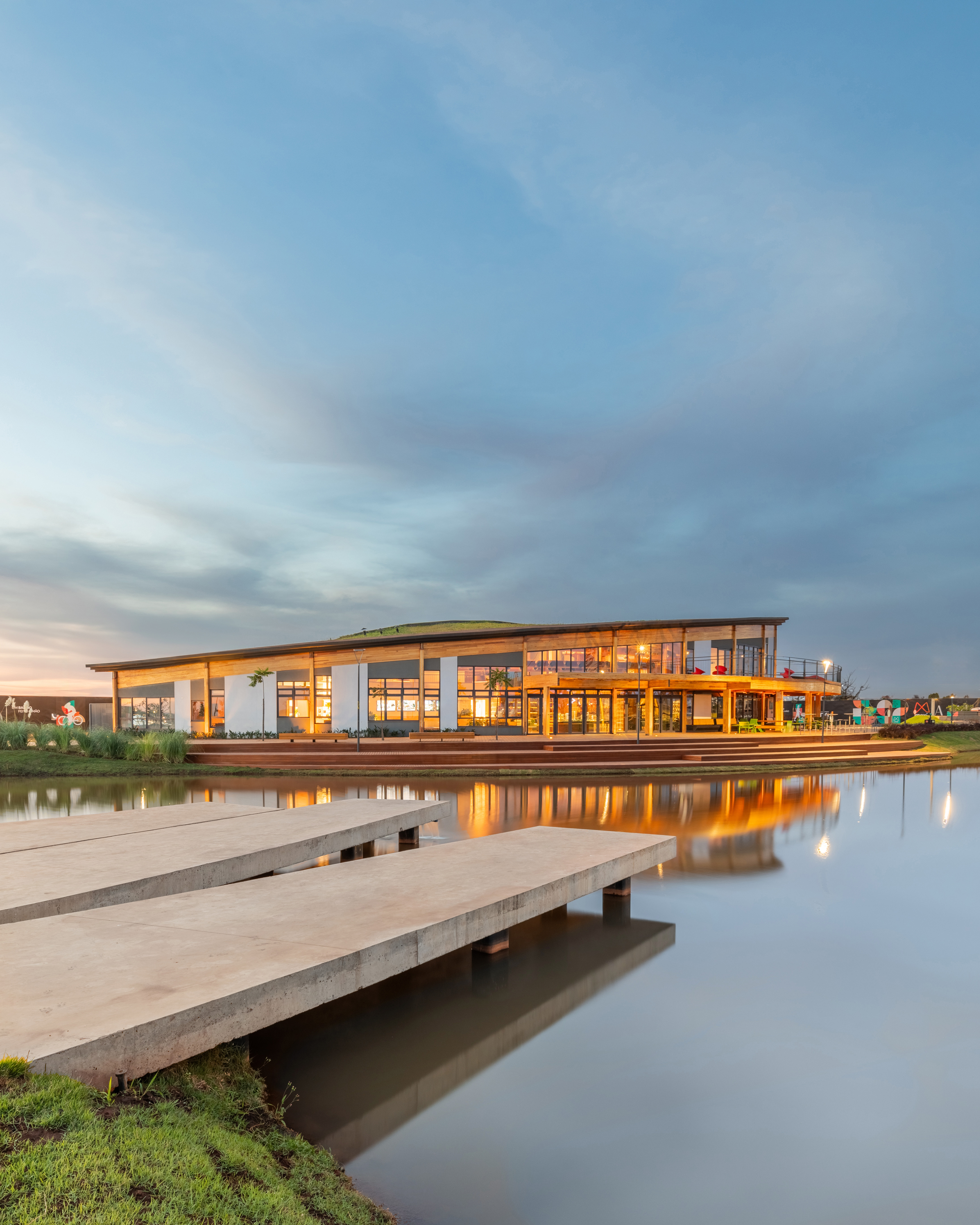 Casa Una is a multi-purpose public building located within Parque Una, a mixed-use urban development in Uberlândia, Brazil. Conceived as a central hub for community life, it accommodates social, cultural, educational, and commercial activities, promoting interaction between residents, visitors, and the city. With a total area of 1,060 square meters, the project emphasizes adaptability, sustainability, and a seamless relationship with its surrounding landscape. Its program includes a reception lounge, neighborhood model, sales and administrative offices, meeting rooms, a mezzanine overlooking the park’s lake, an open-air auditorium, and an educational zone. The comedoria serves meals and refreshments, reinforcing the building’s welcoming and inclusive character. The architecture is defined by a curved glued-laminated timber roof that seems to float above the park, extending beyond the envelope to form shaded transitional zones between interior and exterior. Environmental strategies such as cross ventilation, passive cooling, and the use of renewable materials minimize energy demand while enhancing user comfort. Interiors celebrate material honesty and flexibility, with exposed wood surfaces strengthening the connection to nature and local building traditions. Modular furniture configurations support diverse activities — from exhibitions and lectures to informal gatherings — allowing the space to adapt fluidly to different uses. Open and accessible to the public, Casa Una exemplifies an approach to integrated urban architecture that unites structure, landscape, and community. It represents a model for sustainable civic buildings in emerging urban contexts, translating environmental responsibility into a warm, engaging, and inclusive spatial experience.