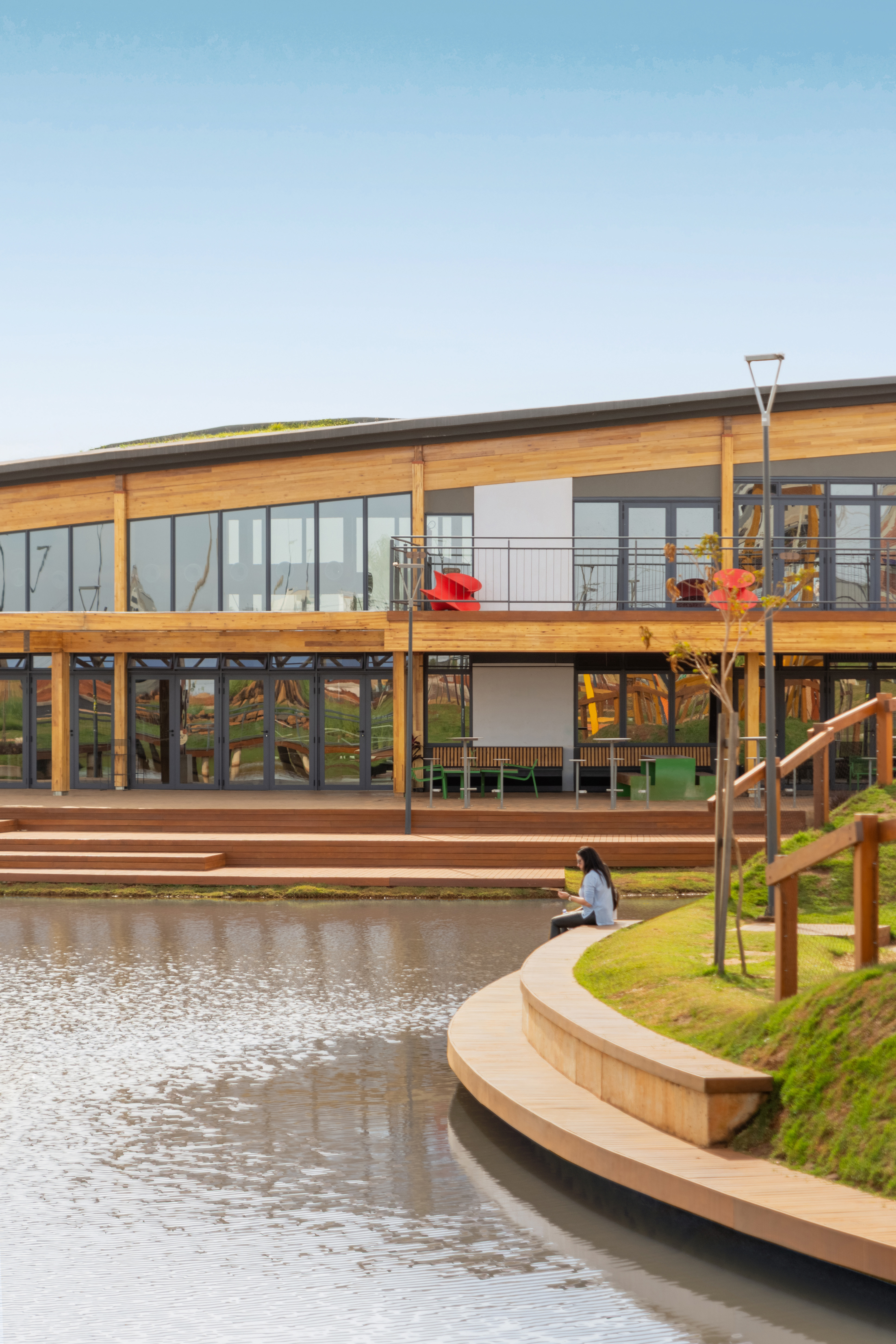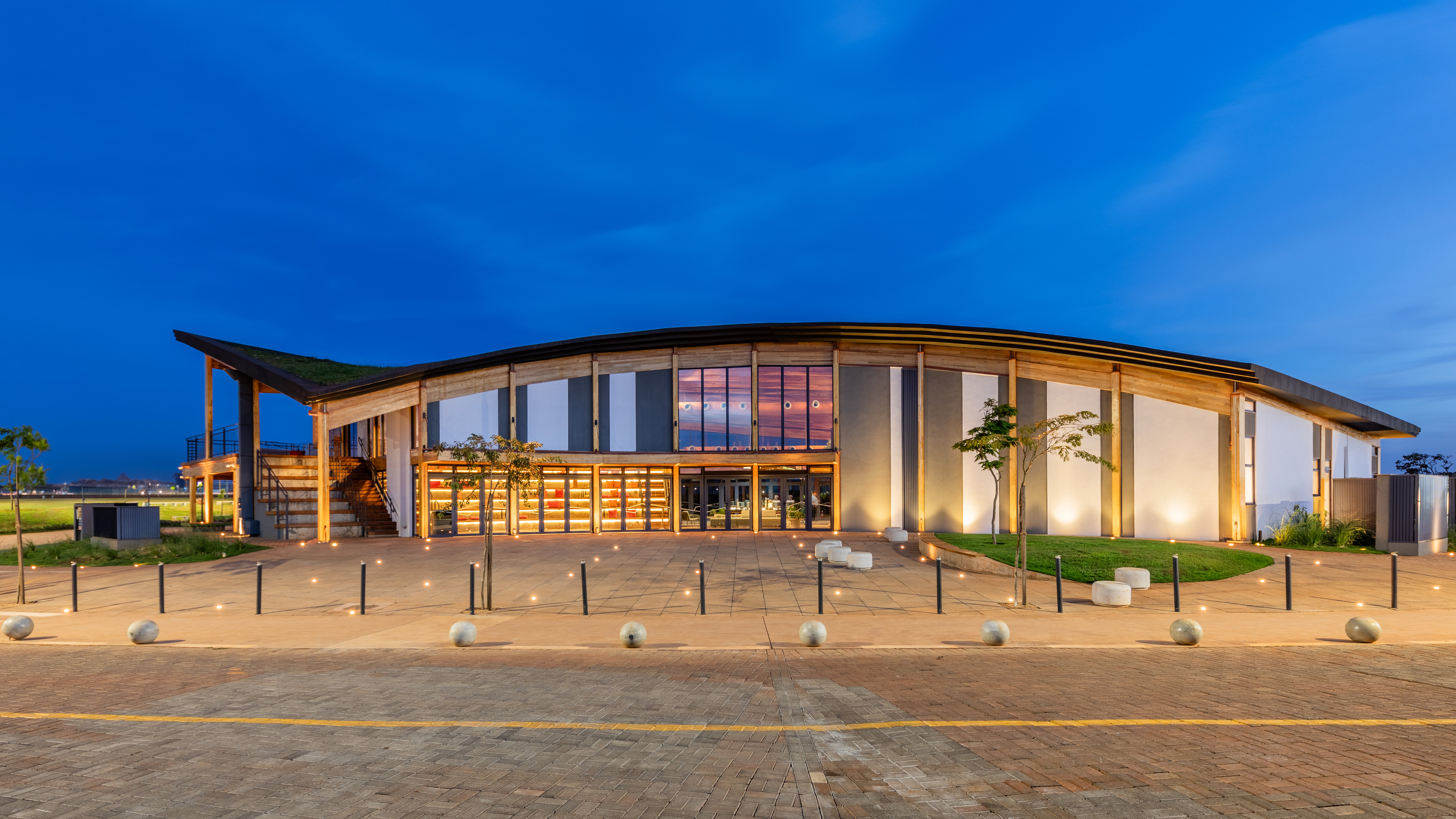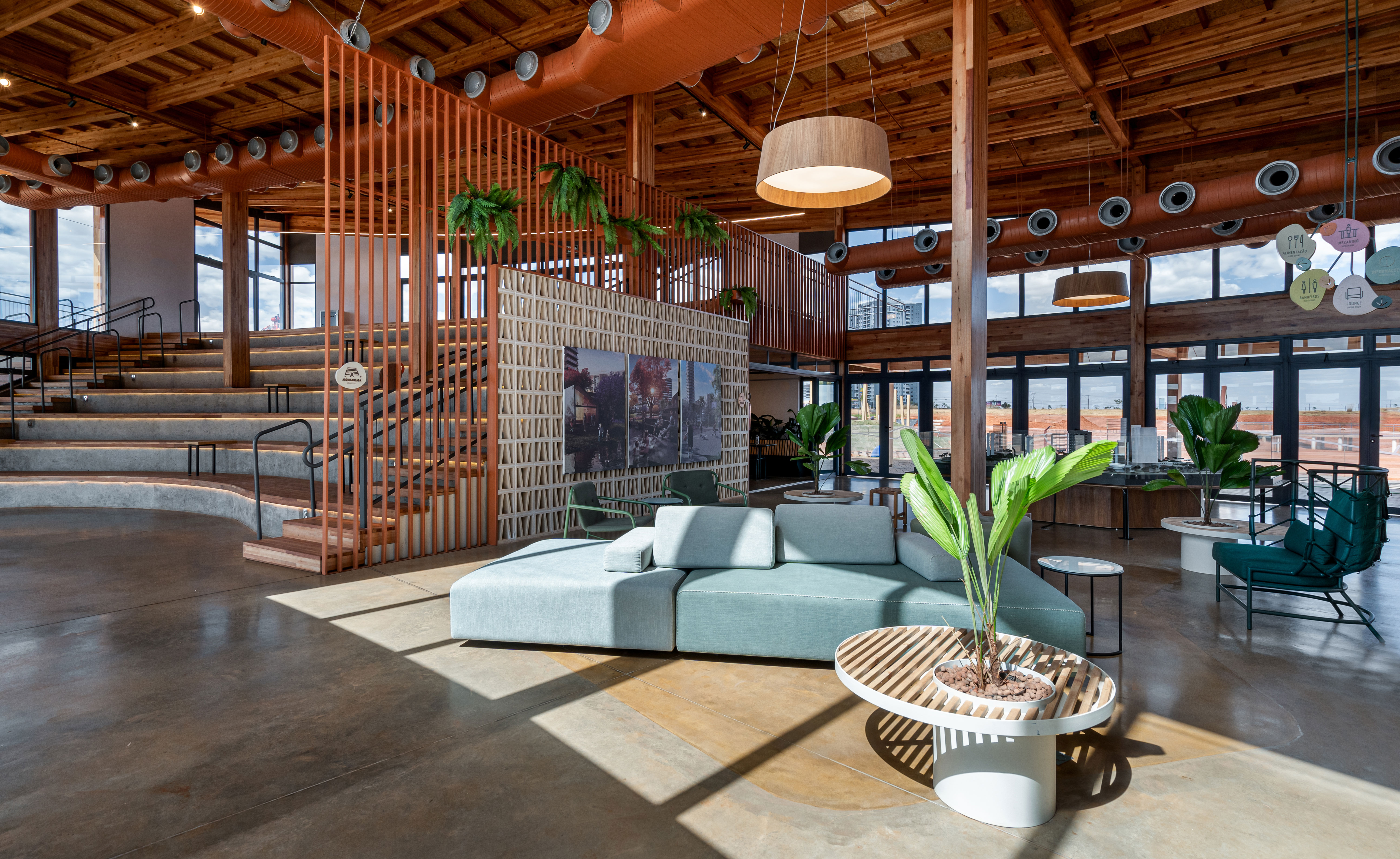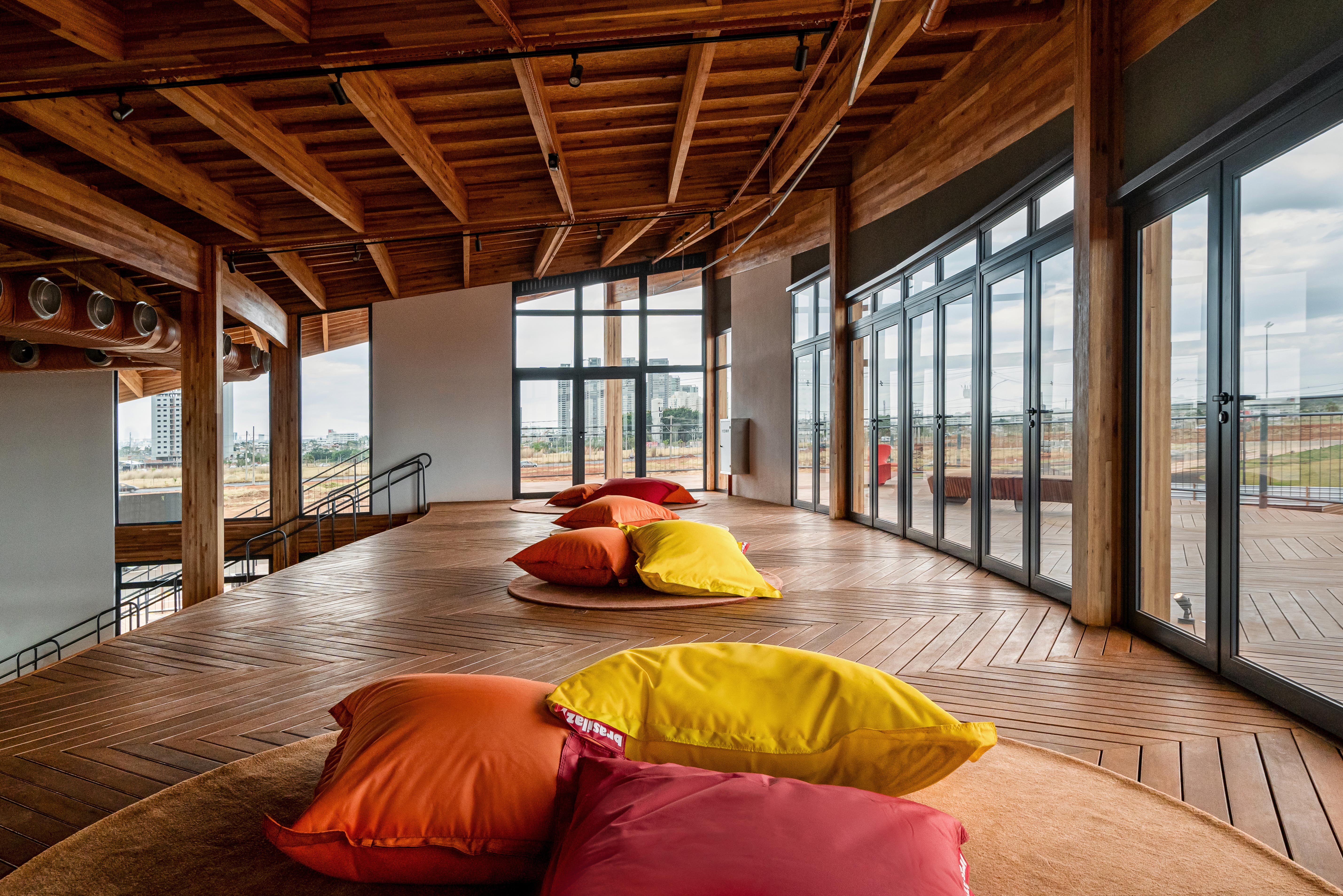 Casa Una is a multi-purpose public building located within Parque Una, a mixed-use urban development in Uberlândia, Brazil. Conceived as a central hub for community life, it accommodates social, cultural, educational, and commercial activities, promoting interaction between residents, visitors, and the city. With a total area of 1,060 square meters, the project emphasizes adaptability, sustainability, and a seamless relationship with its surrounding landscape. Its program includes a reception lounge, neighborhood model, sales and administrative offices, meeting rooms, a mezzanine overlooking the park’s lake, an open-air auditorium, and an educational zone. The comedoria serves meals and refreshments, reinforcing the building’s welcoming and inclusive character. The architecture is defined by a curved glued-laminated timber roof that seems to float above the park, extending beyond the envelope to form shaded transitional zones between interior and exterior. Environmental strategies such as cross ventilation, passive cooling, and the use of renewable materials minimize energy demand while enhancing user comfort. Interiors celebrate material honesty and flexibility, with exposed wood surfaces strengthening the connection to nature and local building traditions. Modular furniture configurations support diverse activities — from exhibitions and lectures to informal gatherings — allowing the space to adapt fluidly to different uses. Open and accessible to the public, Casa Una exemplifies an approach to integrated urban architecture that unites structure, landscape, and community. It represents a model for sustainable civic buildings in emerging urban contexts, translating environmental responsibility into a warm, engaging, and inclusive spatial experience.