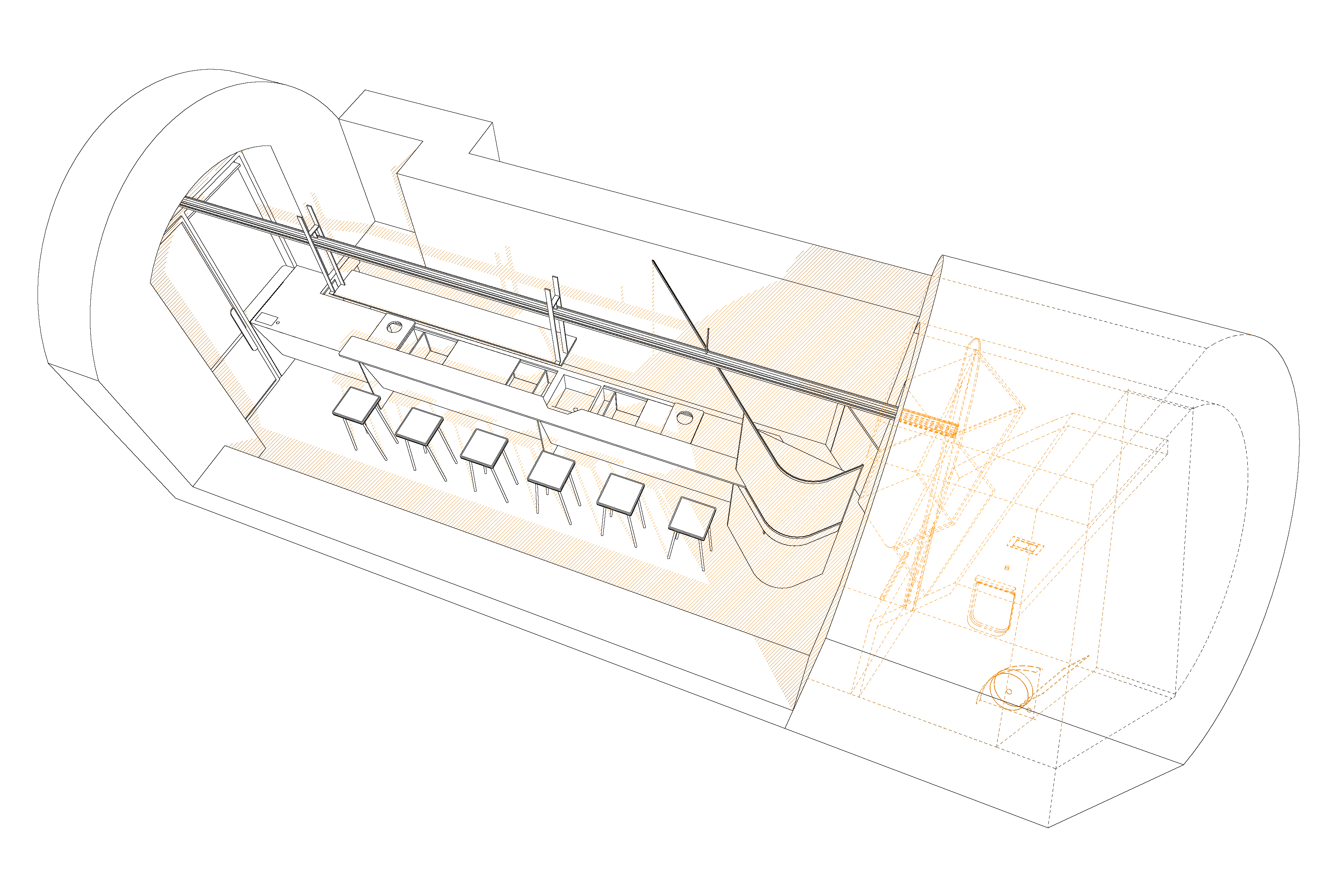 THE PROJECT The project lies within a small, linear vaulted building in the old town of Chania. This peculiar space called for a clean design that could make the best out of the limited area. The design is based on the combination of three elementary geometries. THE BAR First comes the linear bar, that runs from the outer façade to the back of the room, and splits it into two parts, accentuating the perspective of the narrow space. Its’ profile consists of a folded stainless steel sheet, which provides room both for the customers’ seats and the bars’ utilities. This custom piece incorporates all the bar’s electrical wiring and plumbing, leaving the ancient shell and the stone floor intact. The bar is complimented with a custom-made linear lighting piece, which also contains the toilet’s ventilation and runs from the back of the room to the exterior façade. THE MIRROR The second piece is a zig-zag surface at the back of the space that sets the outline of the toilet and storage. Its’ space is designed to allow the movement of the staff around the bar, and is layered with mirror panels, in order to render it “invisible” to the customer’s eyes, “enlarge” the room’s length and make its interior perspective more intense. THE CURVE Last comes the curve. At the end of the bar, a convex surface sets the path around it, while at the same time provides space for storage. It is made out of a perforated steel sheet, that filters the customer’s gaze without constituting an opaque element in this limited space. The rest of the space remains as is, with plastered walls and the vault’s stonework visible to the eye.