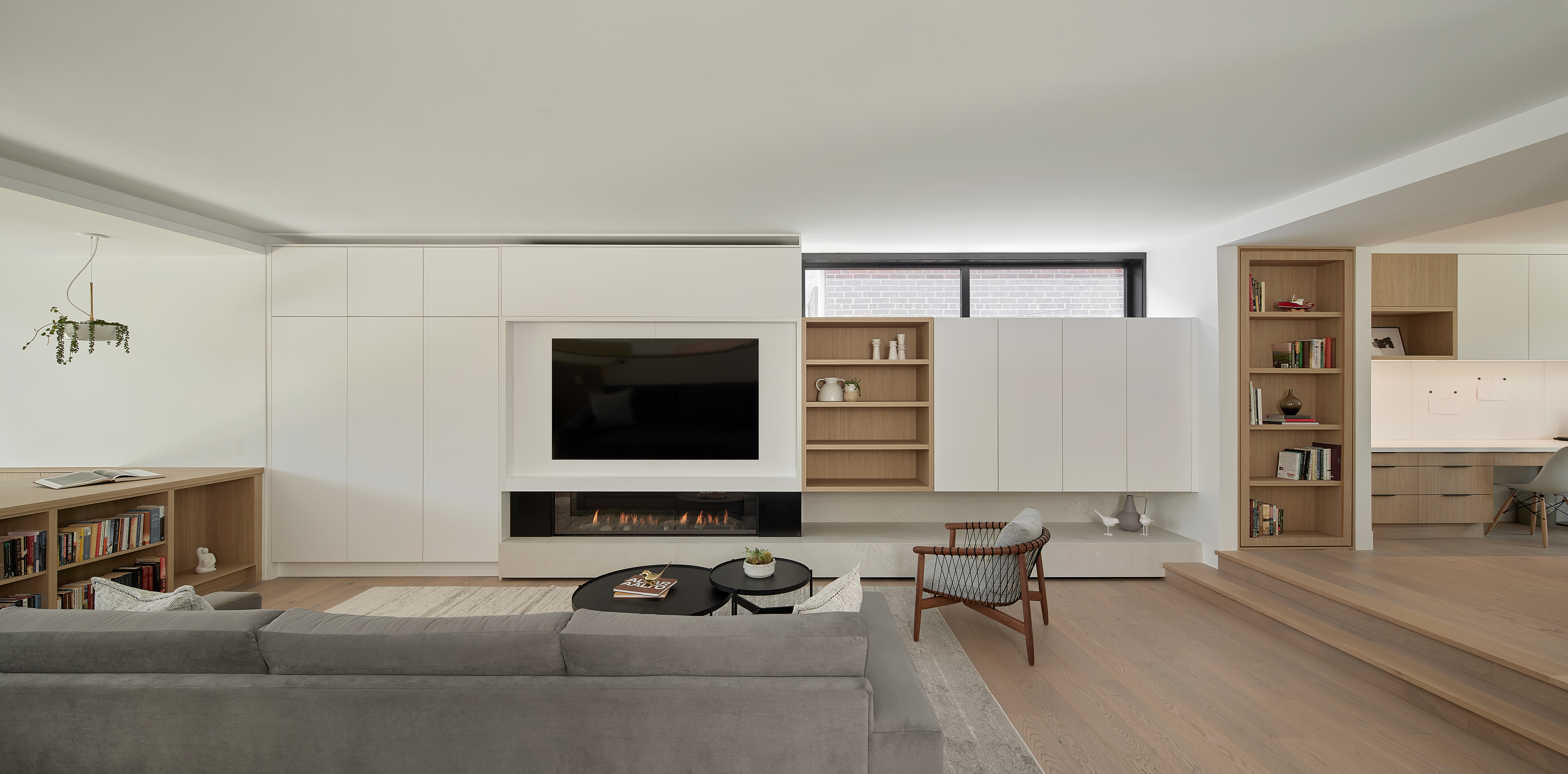 Mars House is a project that was sparked by the shifting demands brought on by the pandemic. It was meticulously designed to cater to a small family's evolving needs, while offering a tranquil retreat from the bustle of urban life. The design focuses on creating a harmonious balance between private and shared spaces, carefully tailored to support the family’s daily routines and foster a sense of connection. The home was conceived as a series of dynamic yet cohesive spaces, carefully organized to maximize efficiency and functionality. The primary catalyst of the design was the client's request for a basketball court and flexible gym space with 18 foot ceilings. In order to facilitate this on a moderately sized urban lot, a unique split level layout was implemented. This created a collection of spaces, each with its own distinct function, yet all interconnected to foster a sense of togetherness throughout the home. This interconnection of spaces is mirrored at the exterior, where interlocking volumes are arranged with the upper stories set back, creating a gentle transition from street level. The sense of movement is further emphasized by the rhythmically patterned black metal cladding, which is accentuated by warm wood siding and porcelain slabs. The design also carefully orchestrates a varied spatial experience as one moves through the home. Spaces are thoughtfully crafted to contract and expand, cultivating a feeling of intimacy in some areas while heightening the sense of openness in others. Natural light plays an important role in the quality of space and filters throughout Mars House via strategically placed windows and skylights. Expansive glazing and large oversized sliding doors extend the kitchen and dining areas onto a spacious deck, seamlessly integrating indoor and outdoor living.